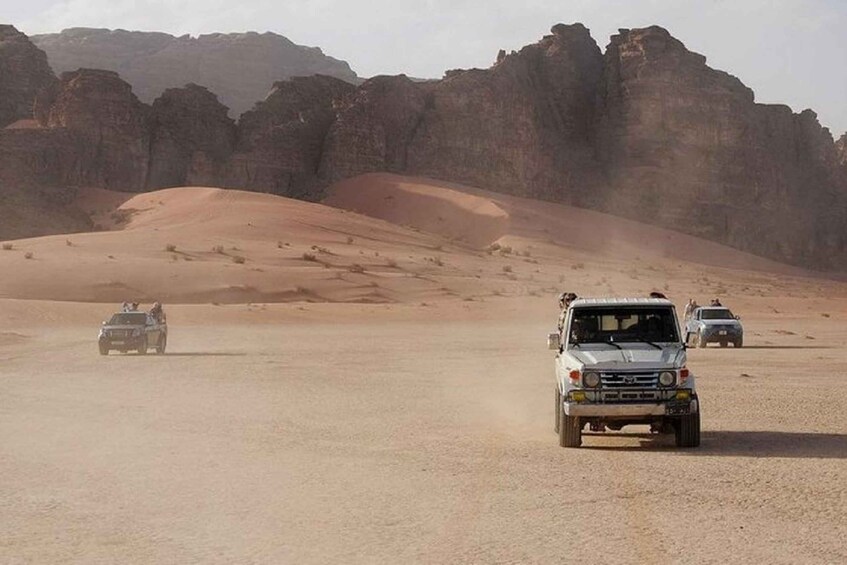 • Nachdem du früh von deinem Hotel in Amman abgeholt wurdest, steigst du in dein privates, klimatisiertes Fahrzeug mit deinem Fahrer. Bewundere dann die zerklüfteten Landschaften Jordaniens, während du auf dem Wüstenhighway in Richtung Wadi Rum fährst. Diese von der UNESCO geschützte Wildnis liegt im Süden Jordaniens und besteht aus rosafarbenen Wüstenebenen, die von Bergen, Klippen und Schluchten unterbrochen werden, die traditionell von Beduinenstämmen bewohnt werden. Das Wadi ist auch der Ort, an dem T.E. Lawrence, besser bekannt als “Lawrence von Arabien”, kämpfte während des Ersten Weltkriegs an der Seite der Beduinen und hier wurden viele Szenen des Filmepos “Lawrence von Arabien” von 1962 gedreht. Bei deiner Ankunft tauschst du dein Fahrzeug gegen einen Geländewagen mit einem Beduinen am Steuer und fährst zum Wadi Rum Besucherzentrum am Tor zum Tal. Dann geht es auf eine 4x4-Tour durch die Gegend. Passiere die hoch aufragenden Bergsäulen, die nach Lawrence' Buch “Sieben Säulen” genannt werden, und genieße die atemberaubende, mondähnliche Landschaft, während du rote Dünen und hoch aufragende Granitfelsen passierst. Halte an, um natürliche Highlights wie den Hanging Arch und die Khaza'ali-Quelle, die auch “Lawrence-Quelle” genannt wird, zu besichtigen. Diese natürliche Quelle sprudelt aus einem felsigen Abhang und ist der Ort, an dem Lawrence während des Arabischen Aufstands 1917-1918 gebadet haben soll. Du fährst entlang von Schluchten und Tälern, vorbei an steilen Klippen und Felsformationen und hältst an, um uralte Felskunst und Inschriften zu sehen, die bis zu 12.000 Jahre alt sind. Während deiner Tour kannst du dich in einem Beduinencamp bei einem erfrischenden Tee oder Kaffee entspannen und dich vor oder nach deinen 4x4-Erkundungen mit einem Mittagessen (auf eigene Kosten) stärken. Bevor du dich verabschiedest, verlässt du die Haupttouristenroute des Wadi Rum und folgst weniger besuchten Pfaden nahe der jordanischen Grenze zu Saudi-Arabien. Nachdem du die Landschaft dieser abgelegenen Gegend bewundert hast, fährst du zurück nach Amman und beendest deine Reise mit einem Transfer zum Hotel oder zum Flughafen.