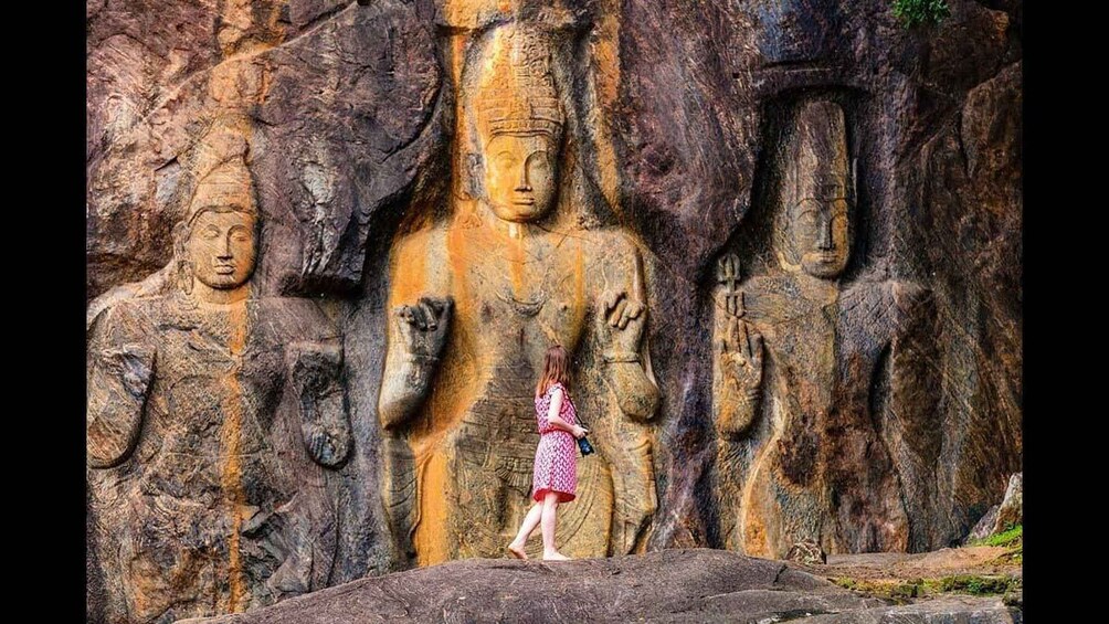 Auf dem Weg nach Ella besuchen wir als erstes den Buduruwagala Felsentempel. Buduruwagala ist ein alter buddhistischer Tempel in Sri Lanka. Der Komplex besteht aus sieben Statuen und gehört der Mahayana-Gedankenschule an. Nächster Halt ist der Ravana-Wasserfall, eine beliebte Sehenswürdigkeit in Sri Lanka. Er ist derzeit einer der größten Wasserfälle des Landes.