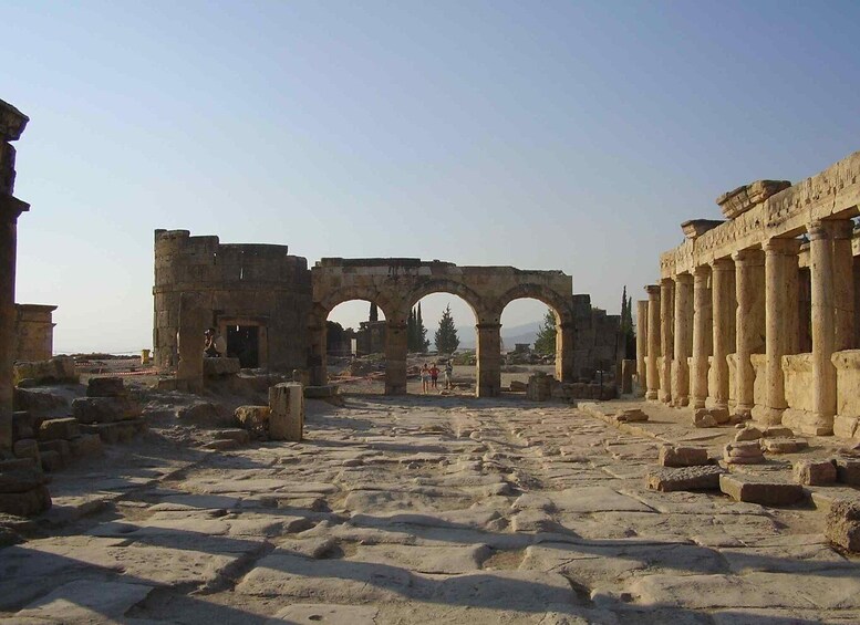 Pamukkale kann man von den Hügeln auf der gegenüberliegenden Seite des Tals in der 20 Kilometer entfernten Stadt Denizli sehen. Auf der Spitze dieser weißen “Burg”, die insgesamt 2.700 Meter lang, 600 Meter breit und 160 Meter hoch ist, wurde die antike Stadt Hierapolis errichtet. Hier kannst du ein antikes römisches Amphitheater, das historische Museum, das früher ein türkisches Bad war, das antike Schwimmbad von Kleopatra, das monumentale Grab von Saint Philippe und die prächtigste Nekropole Anatoliens besuchen.