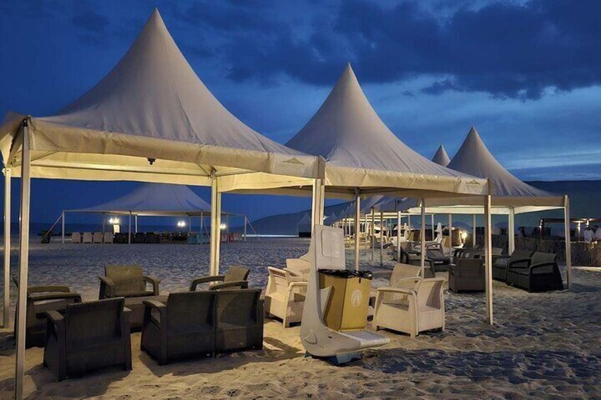 Desert Beach Camp Übernachtung:Es ist ein 14 - 18 Stunden Wüstenstrandaufenthalt mit Option auf Sonnenuntergang Wüstensafari, Nachtsafari oder Sonnenaufgangssafari mit Abendessen und Frühstück