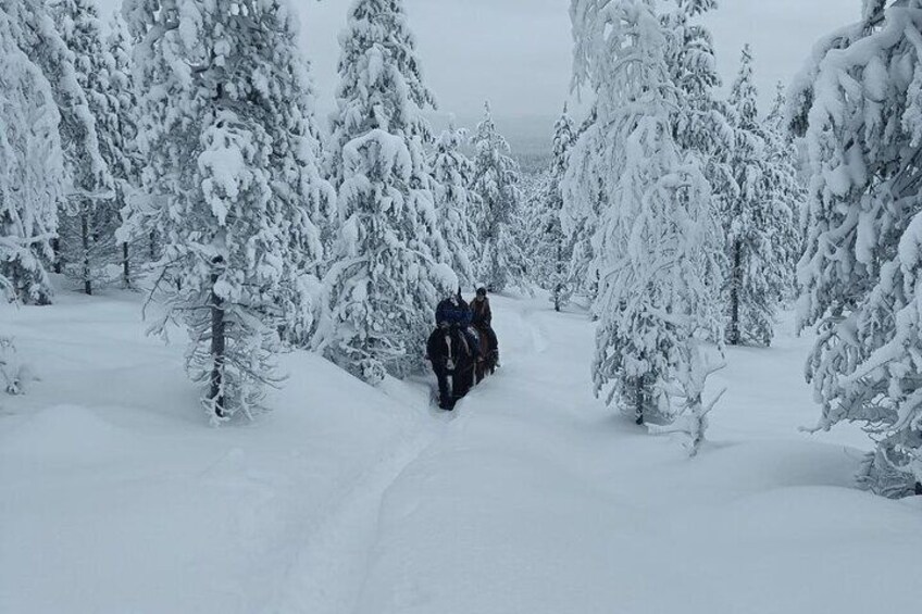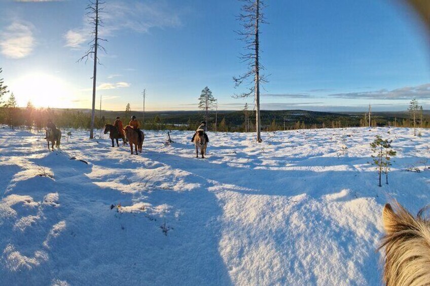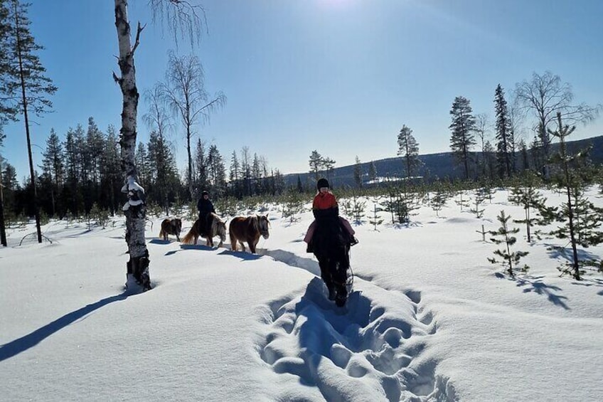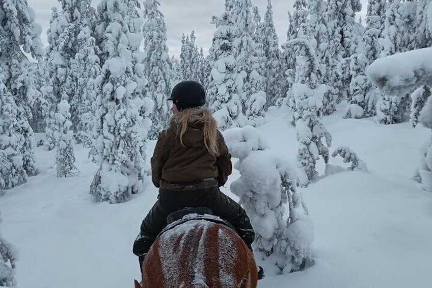 Reiten auf dem Pferdepfad zum verschneiten Hügel
