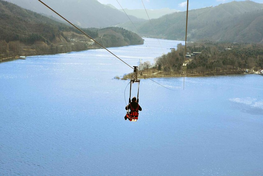 Genieße zum Abschluss eine friedliche Fahrt mit dem Gangchon Railbike durch die atemberaubende koreanische Landschaft - eine perfekte Aktivität, um Kontakte zu knüpfen und die schöne Aussicht zu genießen, bevor du nach Seoul zurückkehrst.