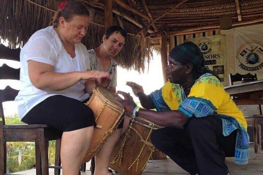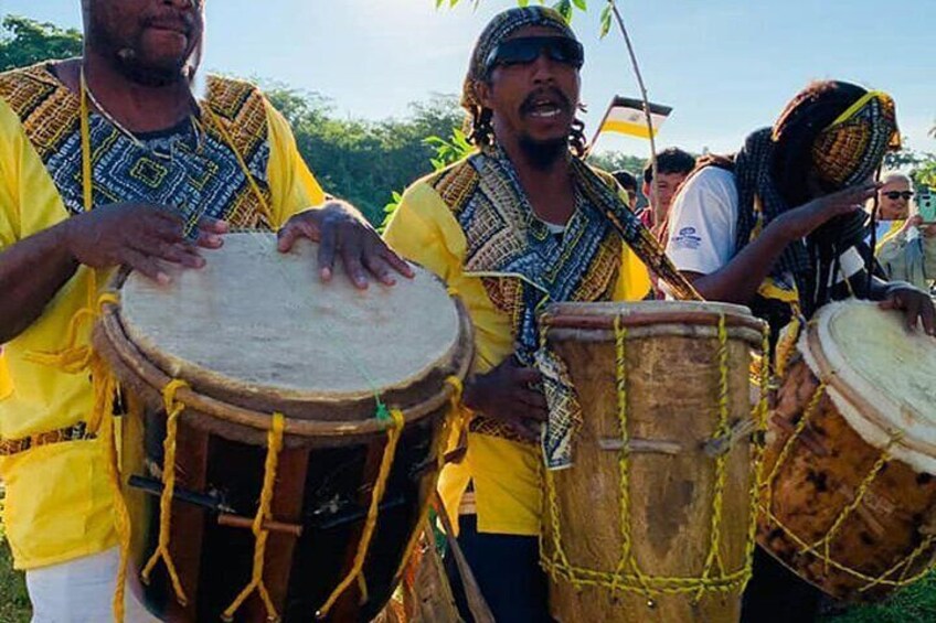 Sonnenuntergang unter dem Ceiba-Baum mit Live-Trommeln über Wasser.