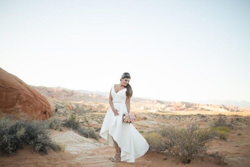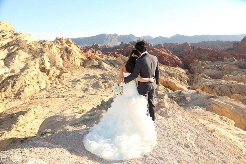 Valley of Fire-Zeremonie; Hin- und Rückfahrt mit Limousine von Las Vegas; Champagner und Gläser; Rosenbouquet und Knopflochblumen, 100 Fotos, Zertifikatsrahmen; 5 bis 7-minütige DVD der Zeremonie