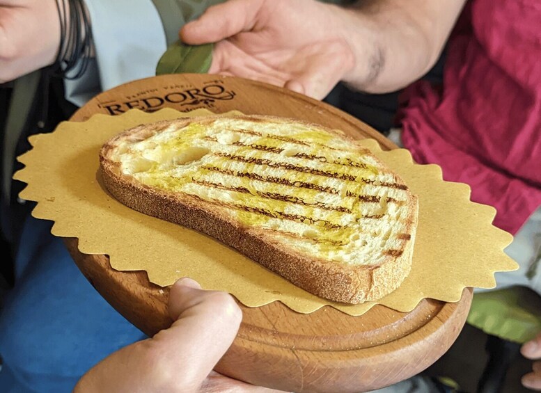 Unser erster Halt ist bei der Bruschetteria Redoro, wo wir eine Auswahl an Olivenölen extra vigin aus der Ölmühle probieren. Am Gardasee herrscht das perfekte Klima für den Olivenanbau, also genieße eine Bruschetta mit diesem flüssigen Gold und rohen Oliven.